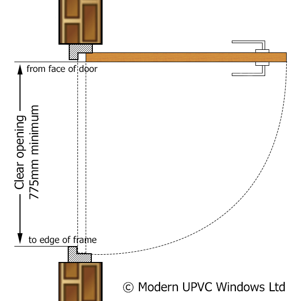 The opening width of principal doors, should be a clear minimum of 775mm, from the edge of the frame to the face of the door leaf open at 090 degrees.