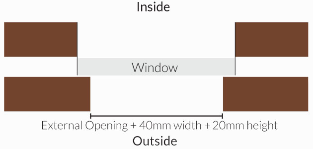 Measure between the external brickwork opening and add 40mm to the width and 20mm* to the height with equal 20mm* sitting behind the brick. (*Providing there is sufficient clearance to do so.)
