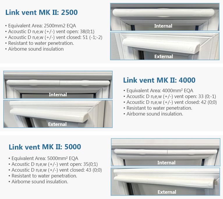 We usually supply Glazpart Link-vents rated at 2500, 4000 and 5000mm² EA (Equivalent Area) to help with compliance with the new Part F regulations. Depending on stock levels we may supply an alternative vent.
